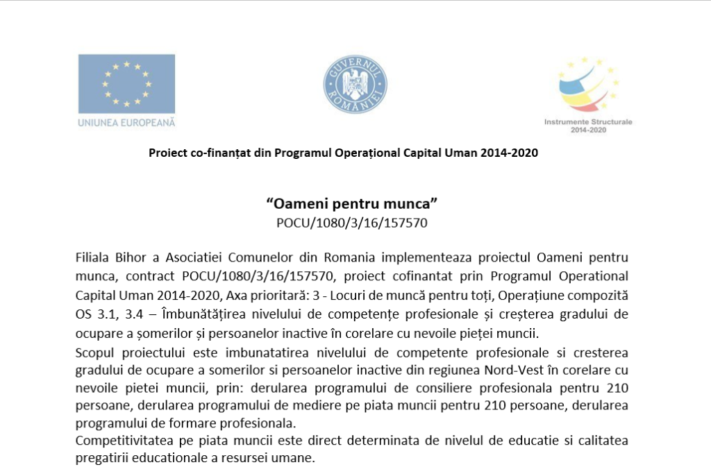 Filiala Bihor a Asociației Comunelor din Romania implementează proiectul Oameni pentru muncă, contract POCU/1080/3/16/157570, proiect cofinanțat prin Programul Operațional Capital Uman 2014-2020, Axa prioritară: 3 – Locuri de muncă pentru toți, Operațiune compozită OS 3.1, 3.4 – Îmbunătățirea nivelului de competențe profesionale și creșterea gradului de ocupare a șomerilor și persoanelor inactive în corelare cu nevoile pieței muncii.